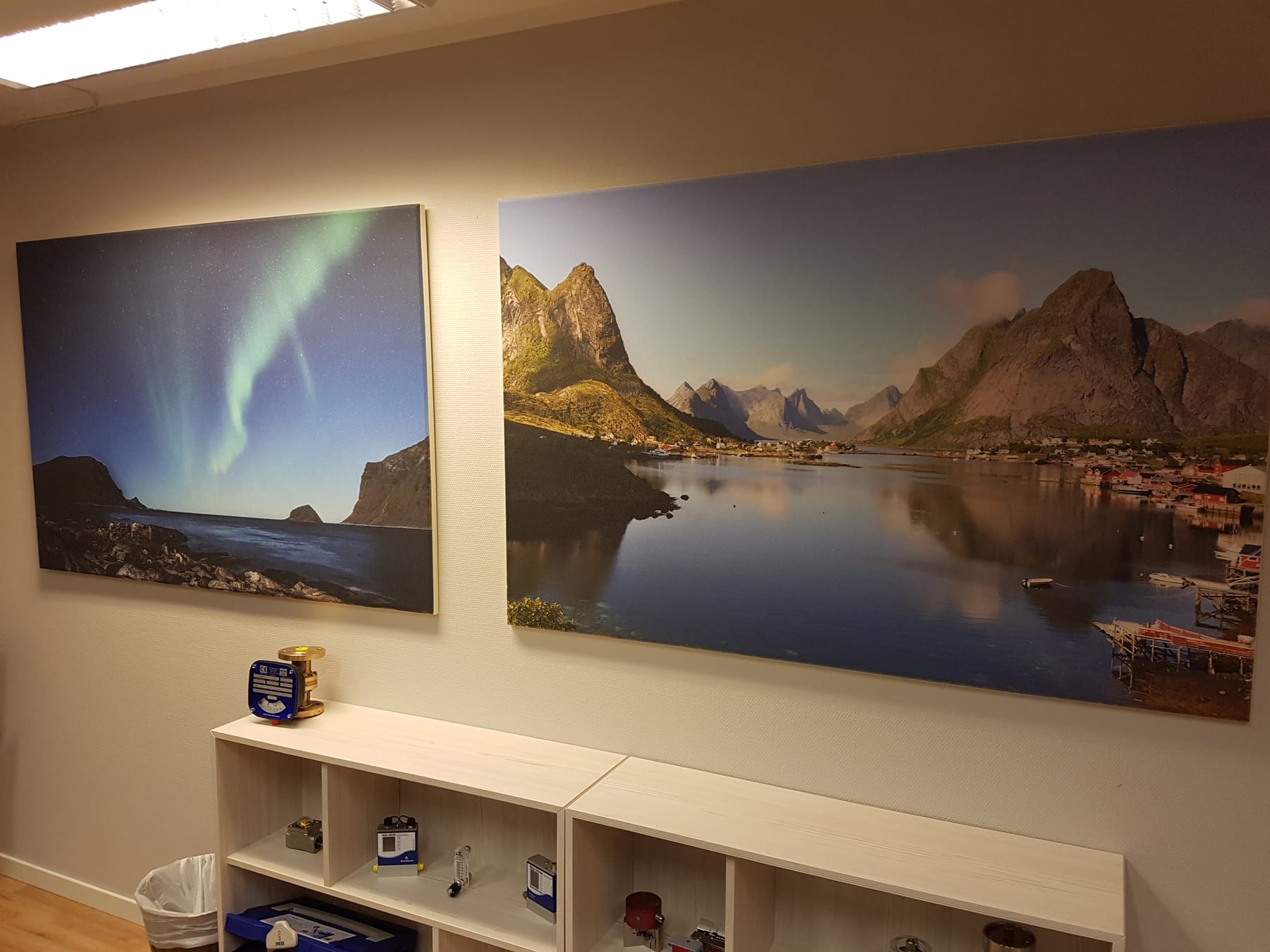 Solution: a combination of Loke™ 40 grey and white. Mounted on ceiling and wall. Frigg™ textile with print on wall.