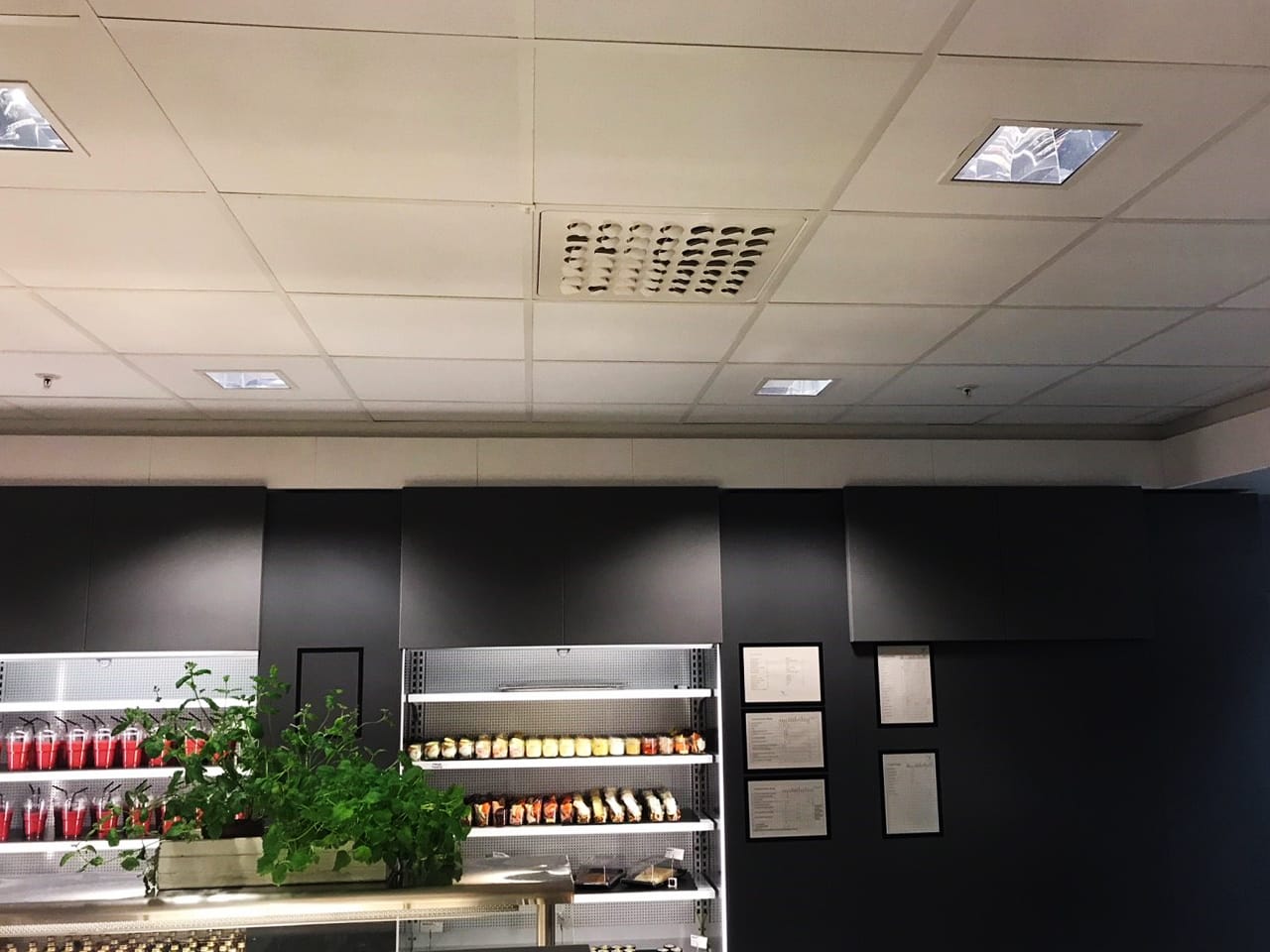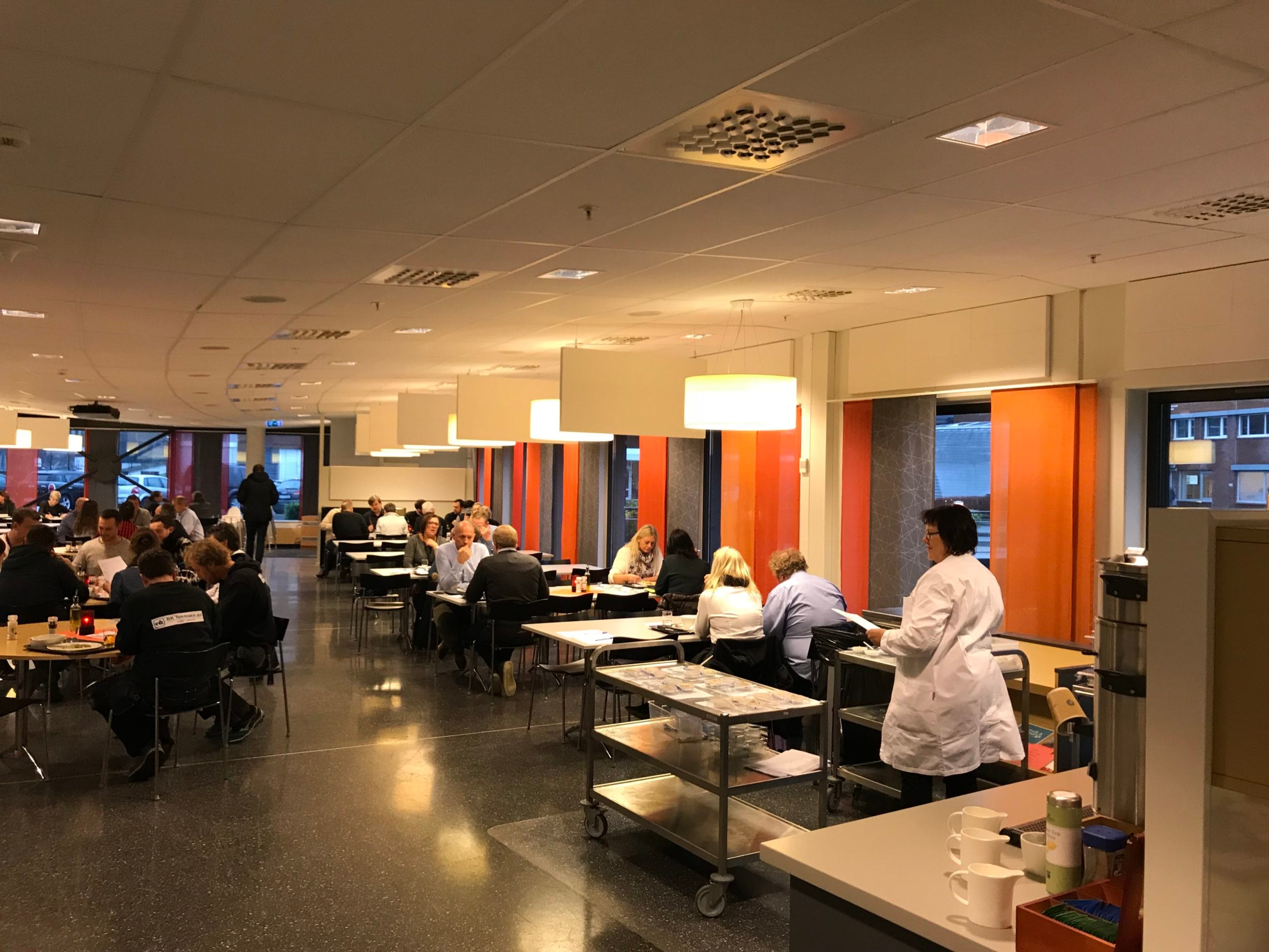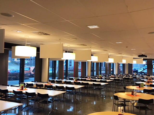A complete solution with many different sound absorbers (discs) improves acoustics, speech clarity and speech perception significantly. An important measure in an extremely busy canteen at the heart of food research.