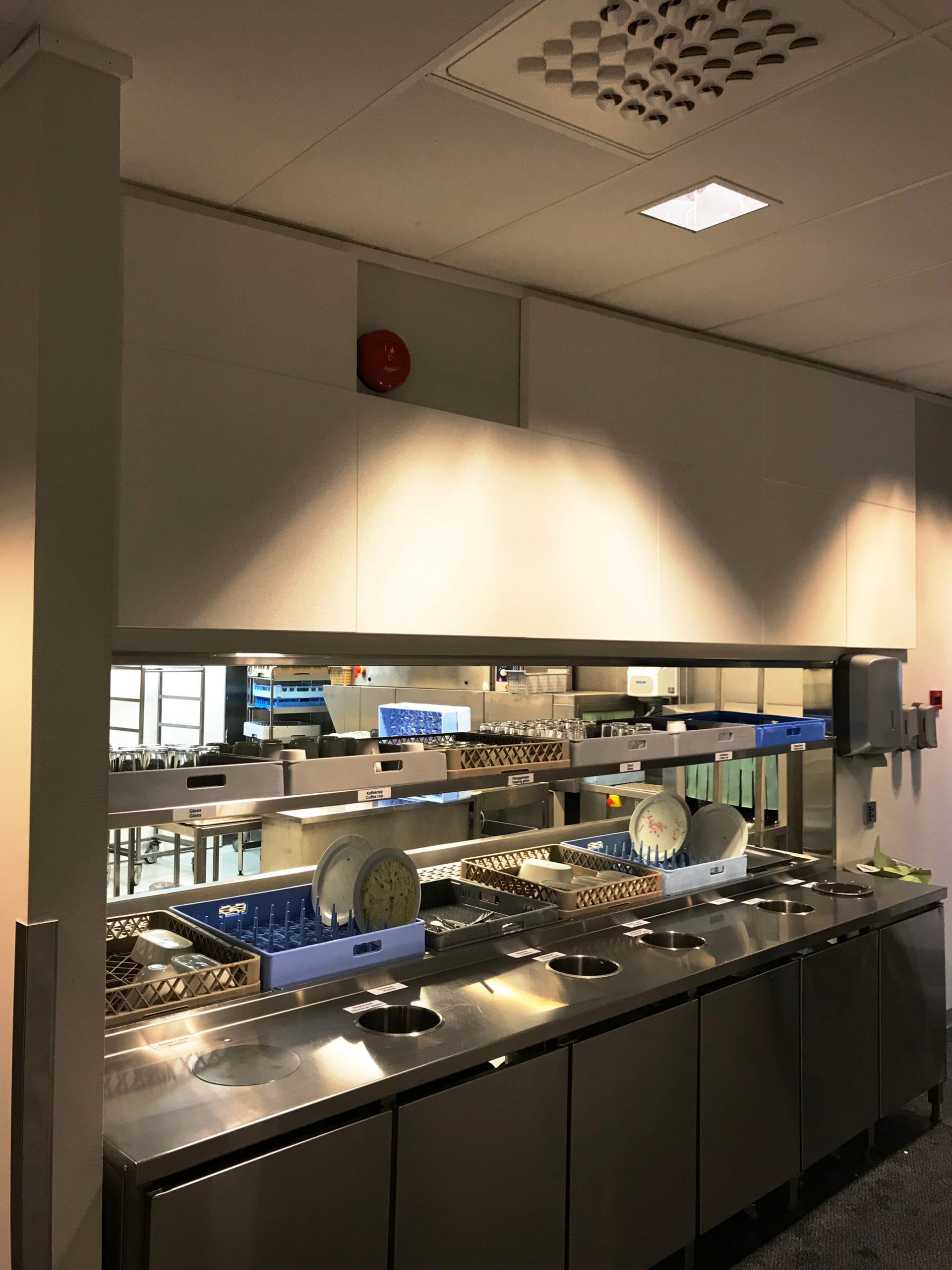 • White hygiene absorbers in the dishwashing zone capture much of the noise before it spreads out into the canteen.