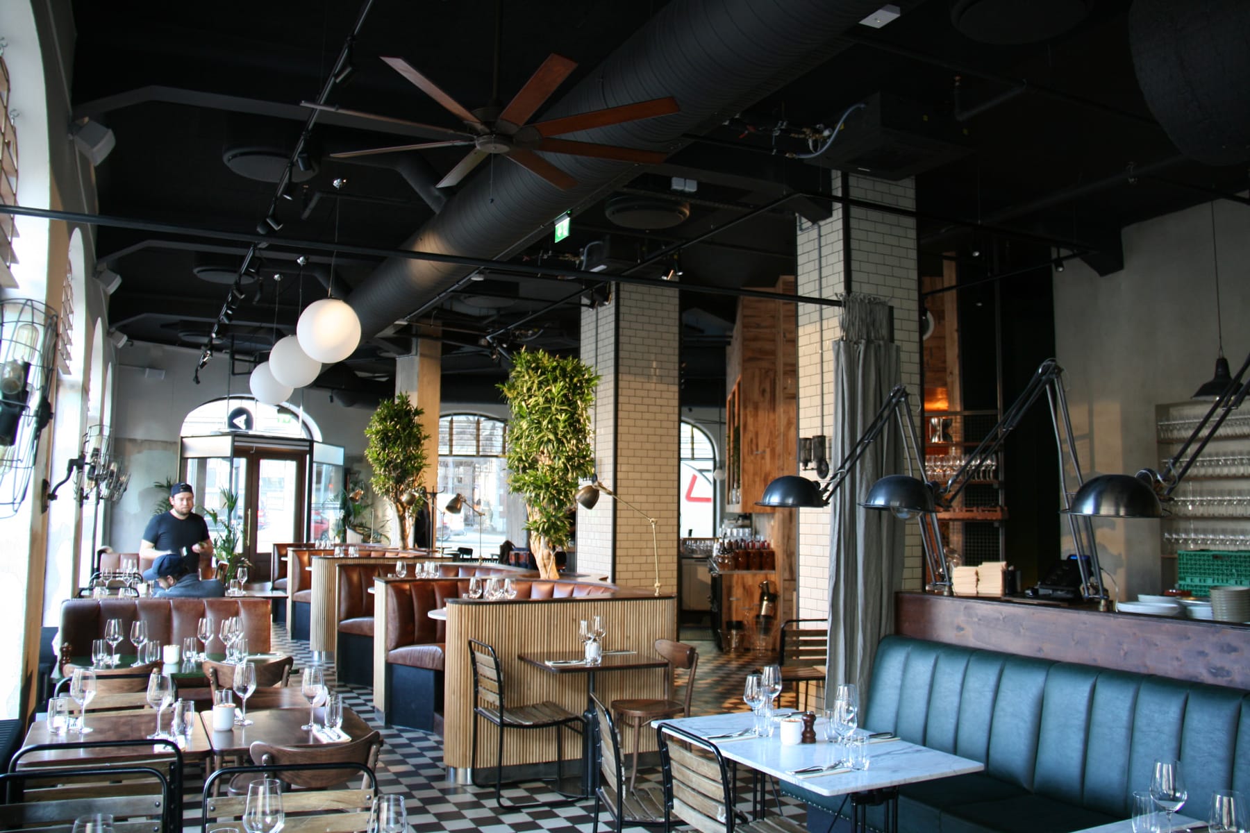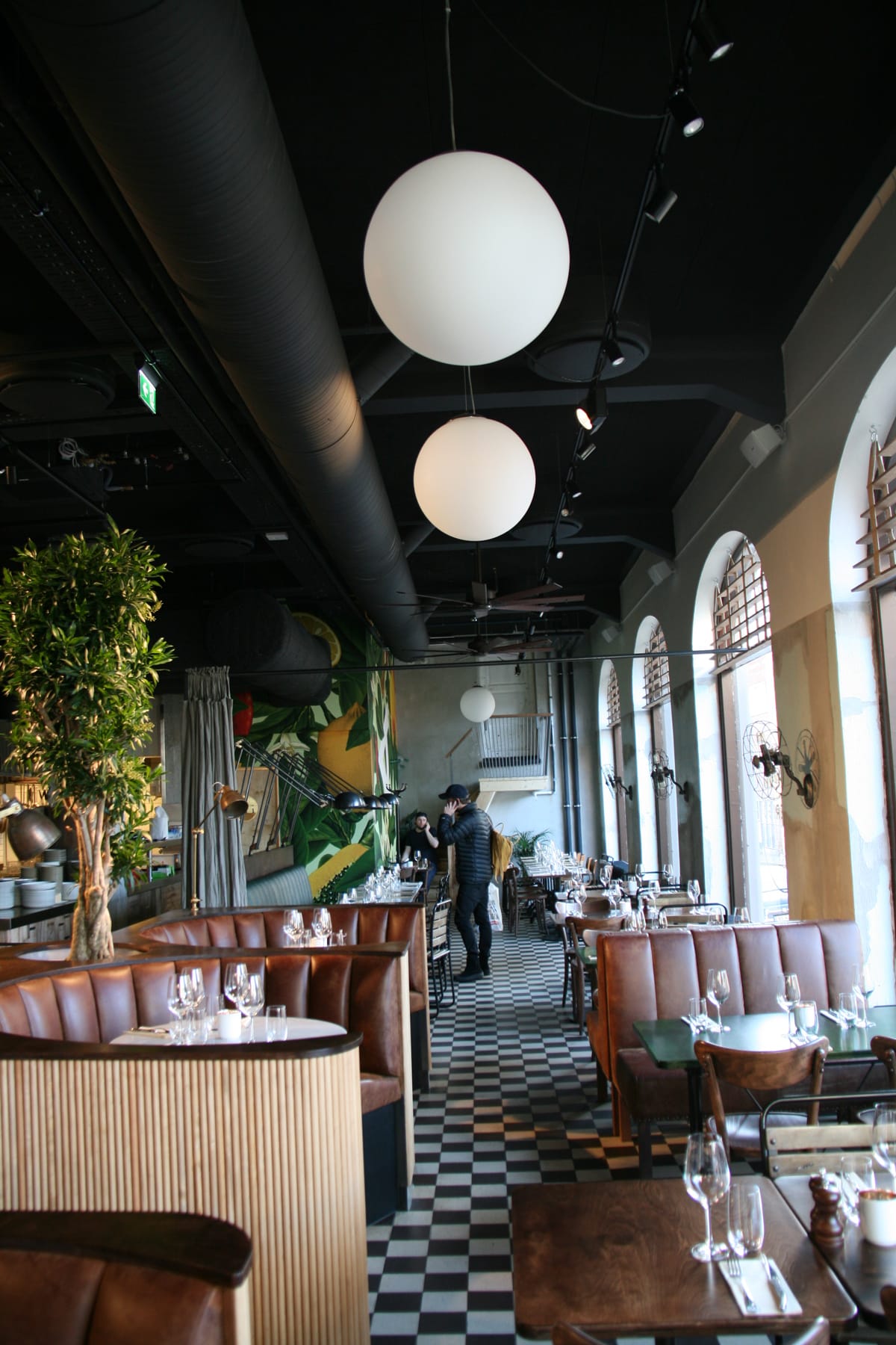 - Black sound-absorbing panels in the ceiling of Amerigo restaurant